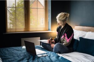 https://unsplash.com/photos/woman-in-purple-and-white-floral-long-sleeve-shirt-and-gray-pants-sitting-on-bed-9pjBx5uVBlg